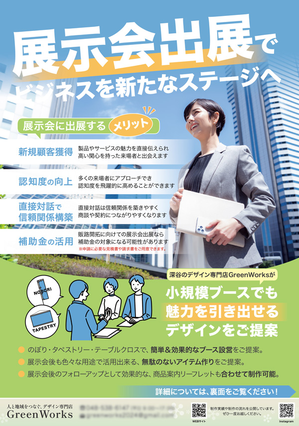 GreenWorksでは「埼玉県や群馬県の中小企業様の挑戦をサポートしたい!」という思いで、小規模スペースの展示会・説明会装飾のデザインサポートもしています。